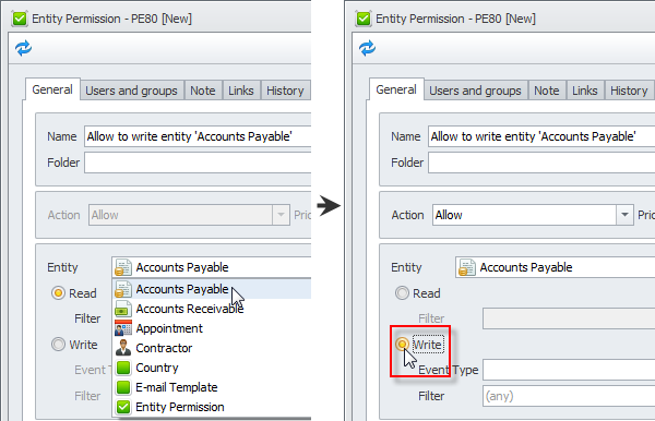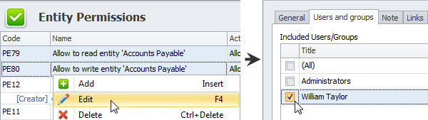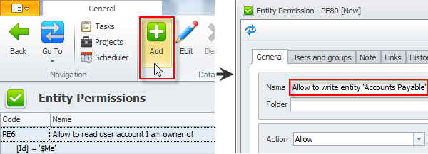 1. On the ribbon, in the Data group, click Add; then in the Entity Permission dialog box, on the General tab, in the Name box, type the name of the new permission.