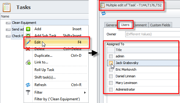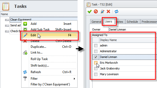 Tip To assign multiple tasks to users at a time, click required tasks while holding down the Ctrl key or the Shift key, right-click the selection, click Edit, click the Users tab, and then select check boxes next to required users in the Assigned To list.