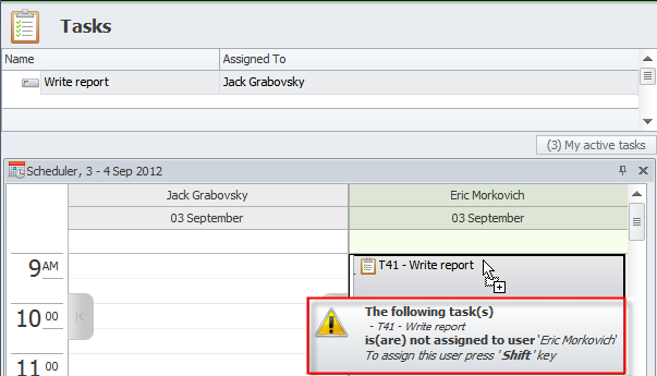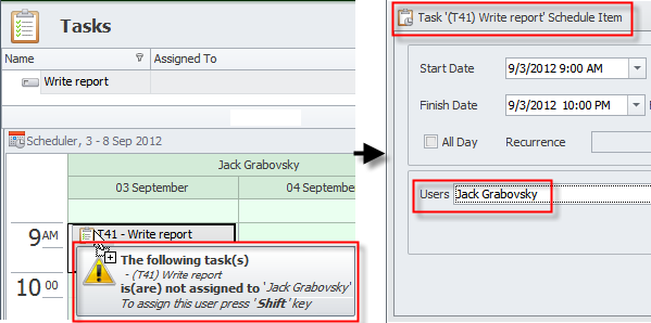 When you drag a task assigned to one user to calendar of another user, the warning message appears. If you drop the task to another user without holding the Shift key, only task schedule item will be assigned to another user, while if you drop the task while holding the Shift key, another user will be assigned to the task too.