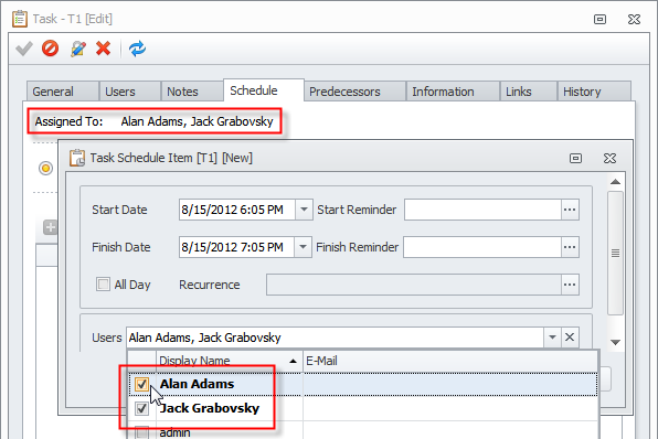 When the task is assigned and you create a task schedule item on the Schedule tab of the Task dialog box, the check boxes next to assigned users are already selected and the names of assigned users are displayed in bold.