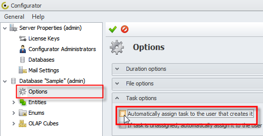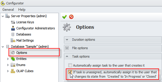 If you want unassigned tasks to be automatically assigned to users who are the first to change tasks state from "Created" to "In Progress" or "Closed", log on to your database in Configurator, click Options, and then select the check box next to the appropriate option.