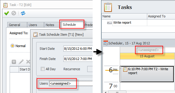 When the task is not assigned and you create a task schedule item on the Schedule tab of the Task dialog box, new task schedule item gets automatically assigned to system user <Unassigned> and appears in the calendar of the <Unassigned> user.