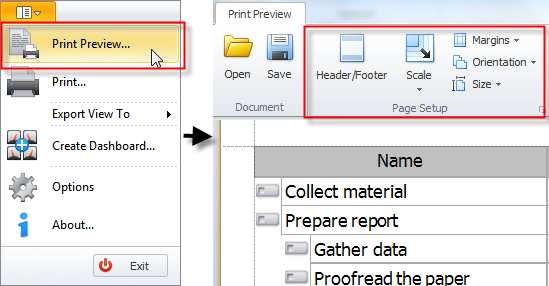 • Click Application Menu, click Print Preview, and then use the commands on the ribbon to make appropriate changes.