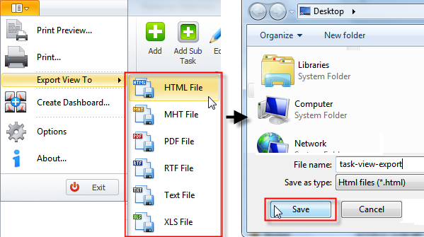 • Click Application Menu, point to Export View To, click required format, and then save the file.