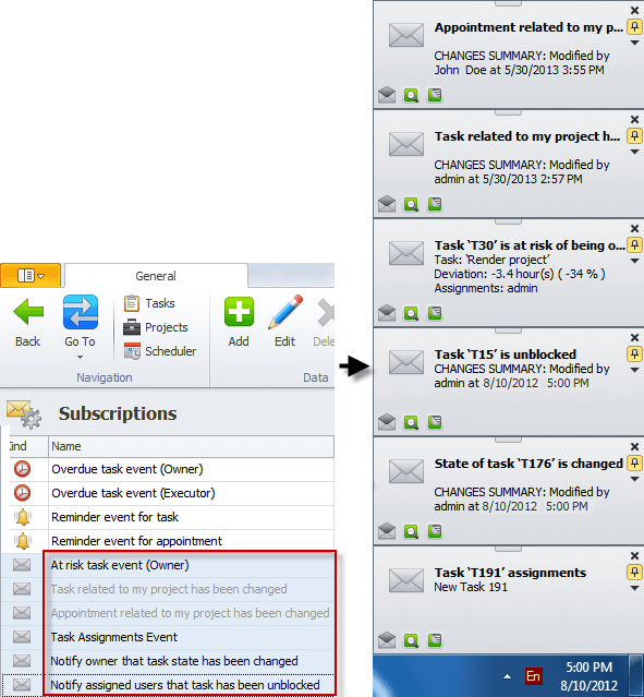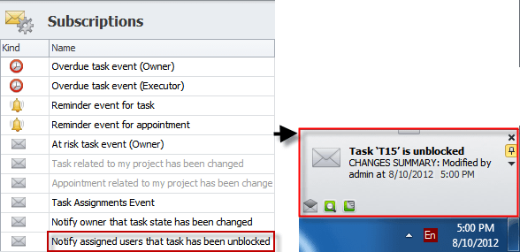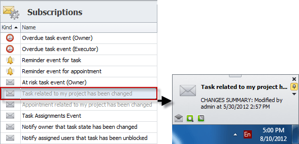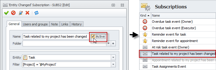 Note By default, both subscriptions "Task related to my project has been changed" and "Appointment related to my project has been changed" are inactive and grayed out. To activate them, open each subscription and check the Active option: