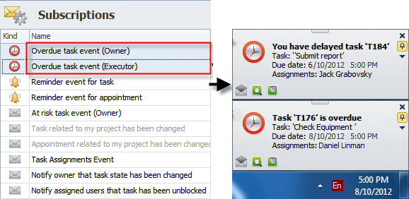 “Overdue” event includes two default subscriptions which notify users of overdue tasks (when Due Date equals or is less than current date):