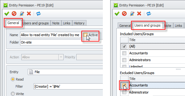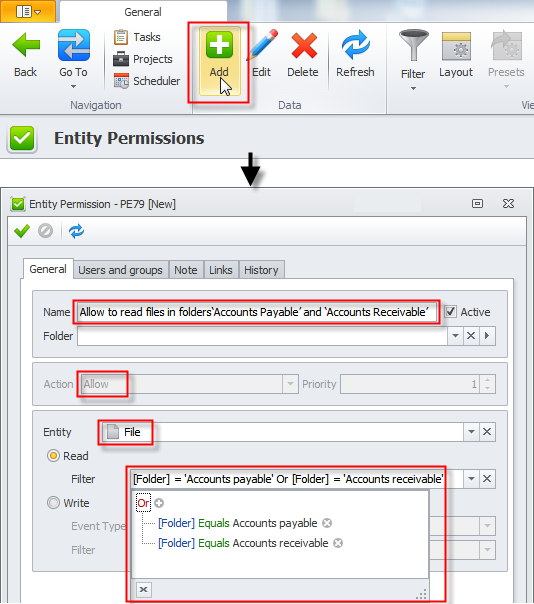 For example, if you want to allow accountants only to see files related to folders “Accounts Payable” and “Accounts Receivable”, click File in the Entity box, click Read, and then in the Filter box, enter filter condition for the given folders: [Folder] Equals Accounts Payable Or [Folder] Equals Accounts Receivable.