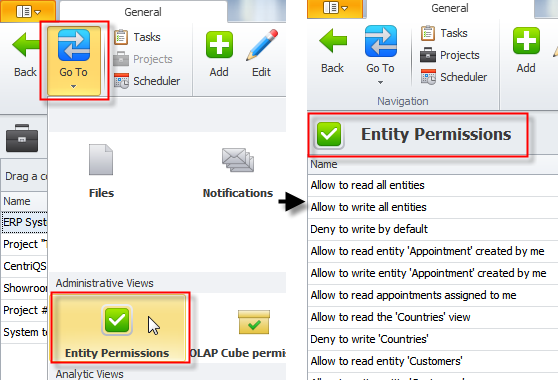 2. On the ribbon, in the Navigation group, click Go To, and then click Entity Permissions.