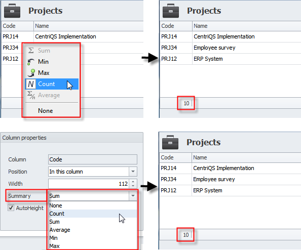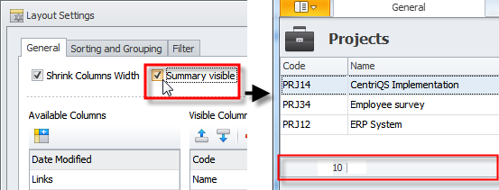 • On the ribbon, in the View group, click Layout, and then on the General tab of the Layout Settings dialog box, click required column in the Visible Columns list, and then click required option in the Summary box of the Column Properties form.