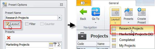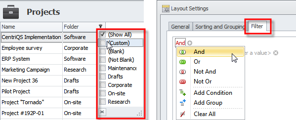 You can set quick filters by columns or add filter conditions on the Filter tab of the Layout Settings dialog box.