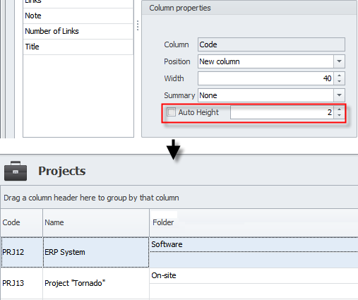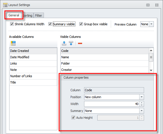 • On the ribbon, in the View group, click Layout, and then on the General tab of the Layout Settings dialog box, click required column in the Visible Columns list, and then enter required settings in the Column Properties form.