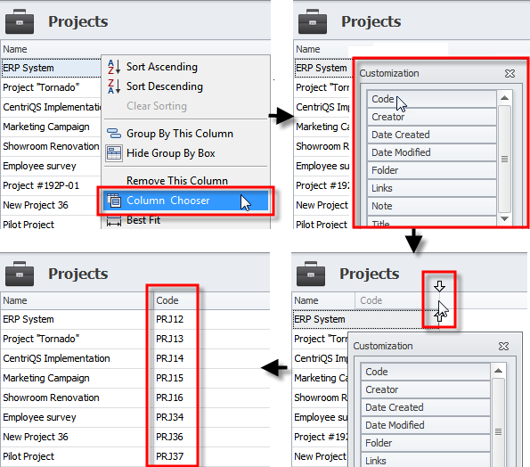 • Right-click any column header, click Column Chooser, and then drag required columns from the Customization dialog box to column headers.