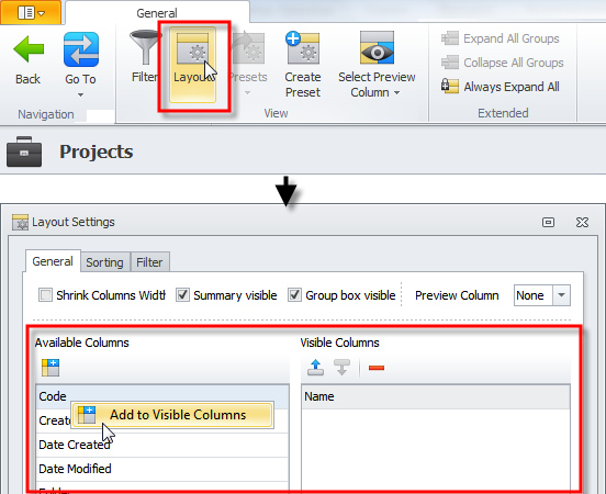 • On the ribbon, in the View group, click Layout, and then on the General tab of the Layout Settings dialog box, drag required columns from the Available Column list to the Visible Column list.