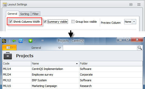 Note You can select the Shrink Columns Width check box to fit the visible columns width to the application window.