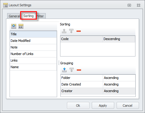 You can also set sorting and grouping in the Layout Settings dialog box.