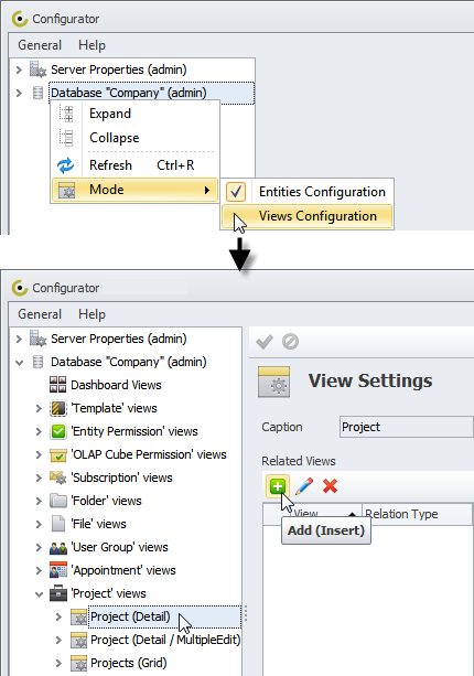 2. Right-click the database, point to Mode, click Views Configuration; then click the right-pointing arrow next to required entity views, click the entity view with (Detail), and then click Add (+) on the toolbar of the Related Views table.