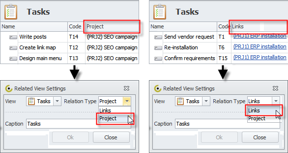 3. In the Related View Settings dialog box, click required view in the View box, click required relation type in the Relation Type, type related view name in the Caption box, and then click OK.