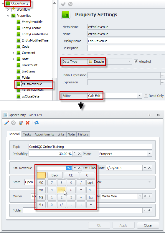 Example: The Estimated Revenue property with the Double data type for calculating estimated revenue of opportunity.