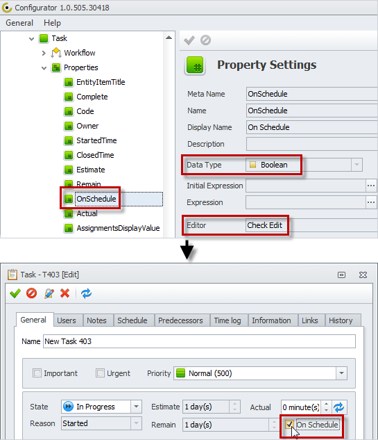 Example: The OnSchedule property with Boolean data type for defining whether tasks are on schedule or not.
