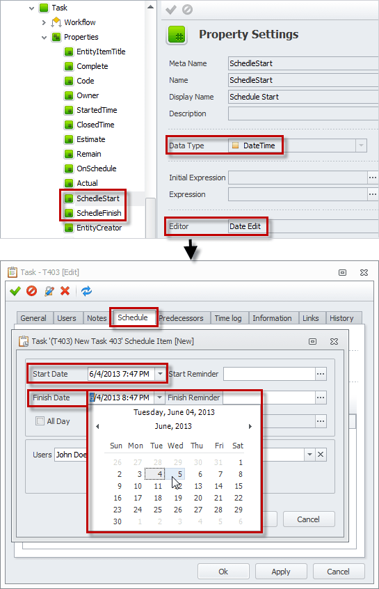 Example: The ScheduleStart and the ScheduleFinish properties with the DateTime data type for entering date and time when you start or finish doing the task.