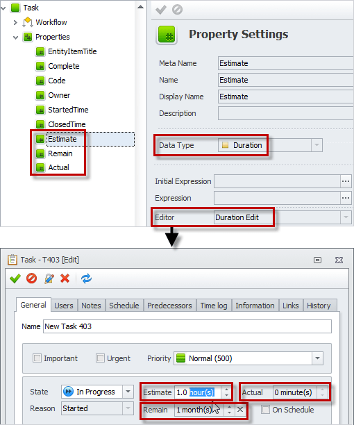 Example: The Estimate, Actual, and Remain properties with the Duration data type for entering estimated, actual, and remaining duration of the task.