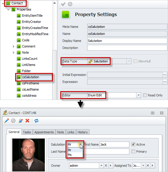 Example: The Salutation property with the given Enum data type for selecting either Mror Ms in the drop-down list (as alternative for selecting contact gender).