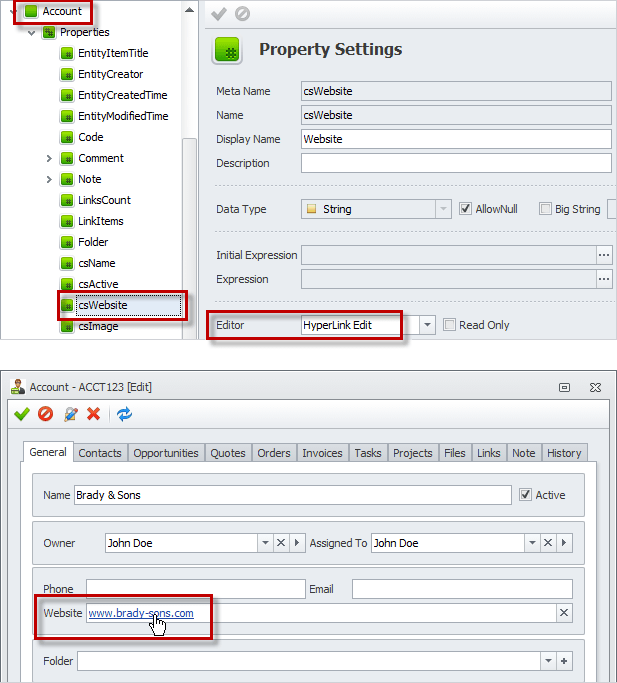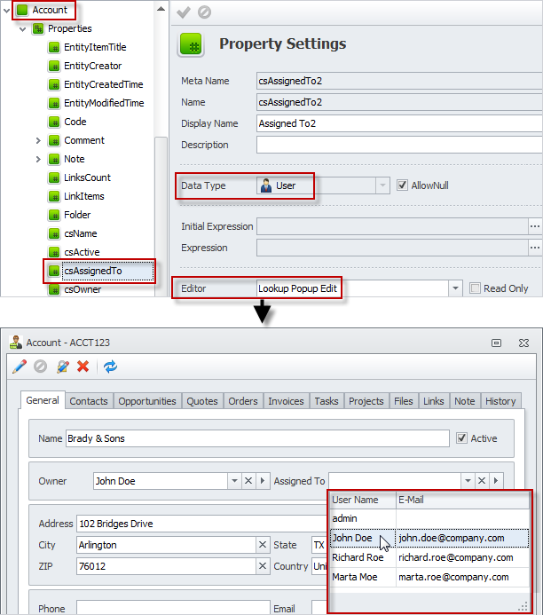 Example: The Assigned To property with the User data type for selecting a user assigned to particular account in the CRM database.
