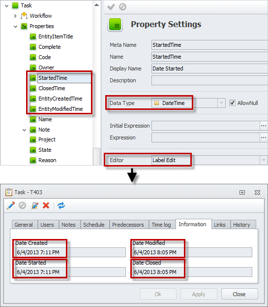 Examples: The StartedTime, the ClosedTime, the EntityCreatedTime, and the EntityModifiedTime properties with the DateTime data type for showing current system date and time that is recorded when you create, start, modify, and close the task.