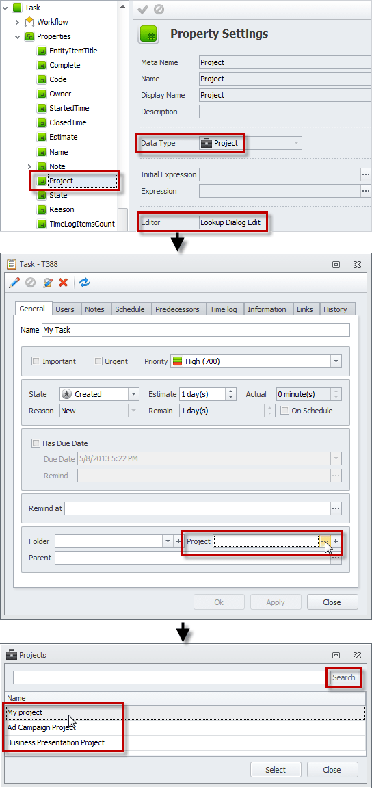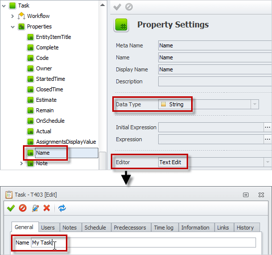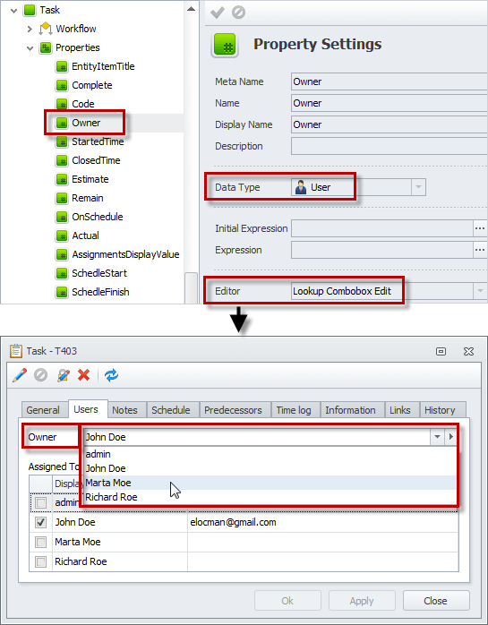 Example: The Owner property with the User data type for showing a list of users, one of which can be selected as task owner.