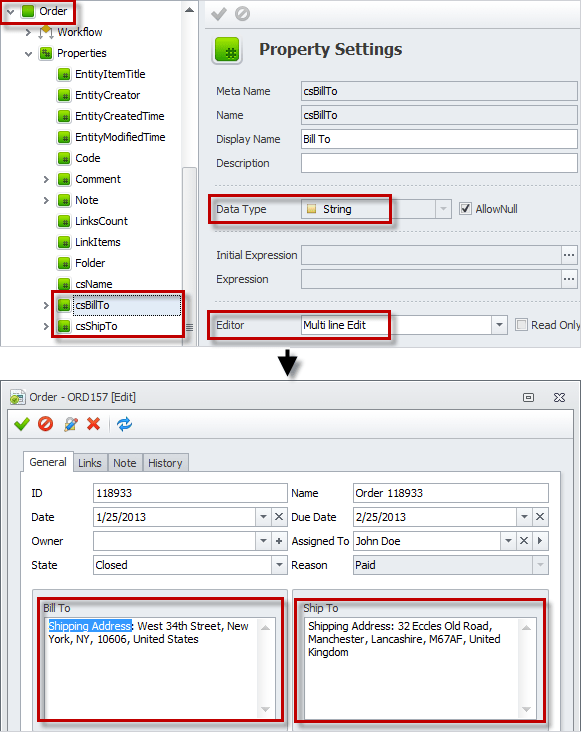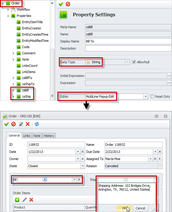 Example: The Bill To and Ship To properties with the String data type for entering mail addresses in the order form.