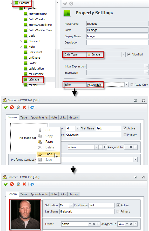 Example: The Image property with Image data type for adding and displaying photos of your contacts.