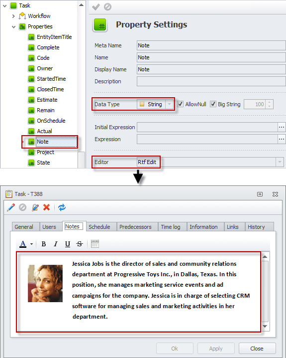 Example: The Note property with the Big String data type for adding task notes with images, bullets, bookmarks, hyperlinks, and other RTF elements.