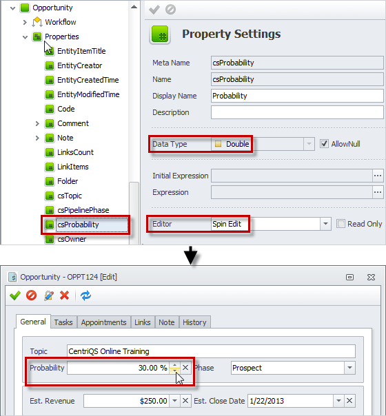 Example: The Probability property with the Double data type for enteringpercentage of opportunity probability.