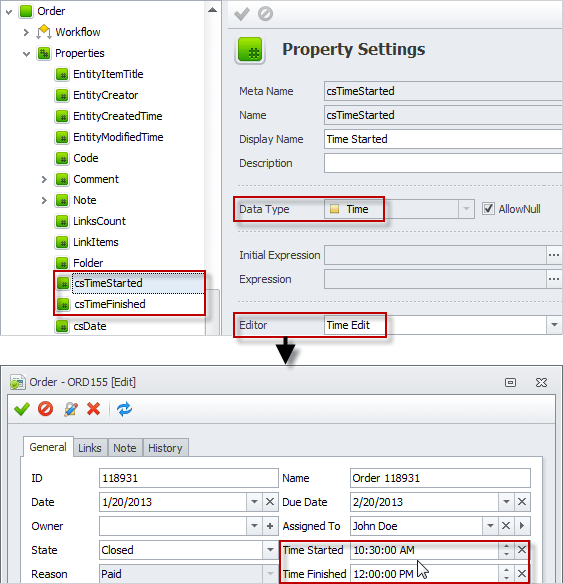 Example: The Time Started and the Time Finished properties with the Time data type for entering time when users start and finish working with customer's orders.