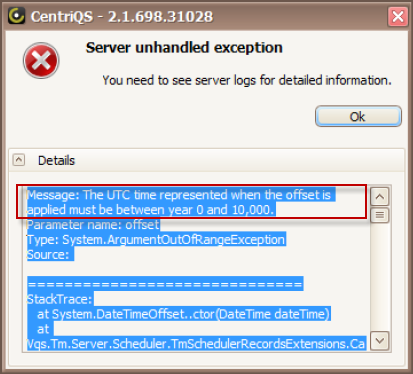 This error message means that .NET Framework incorrectly converted DateTimeOffset values to Coordinated Universal Time (UTC).