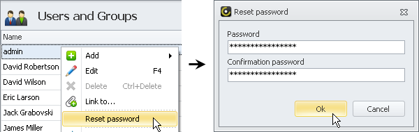 4. In the Reset Password dialog box, type the new password in the Password box and the Confirmation password box.