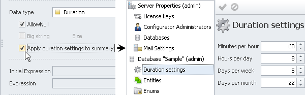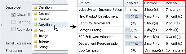 If entity property should display duration units in minutes, hours, weeks or months (for example, Estimated Duration, Remaining Duration, and other properties), click Duration in the Data type list.