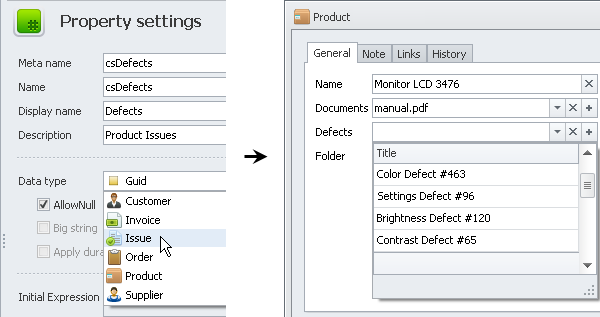 If entity property should refer to a custom entity (for example, Order, Customer, Issue, and other entities), click required custom entity in the Data type list.