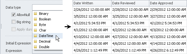 Tip If DateTime property should be filled in automatically, you can use any of available functions in Expression editor. For example, you can use Initial Expression with function “Now()” to automatically fill in the Date Created property with current System.DateTime value.