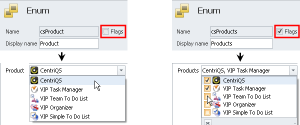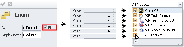 Note Enum with selected Flags check box requires the following values: 1, 2, 4, 8, 16, etc. (that is “2” raised to the power of “N”). By default the program automatically calculates the required values, so you don't need to enter them manually. Note that the All enum value, which allows users select all check boxes in one click, should be entered manually as a sum of all values. For example, the All value for five enum values equals 31 (1+2+4+8+16=31).