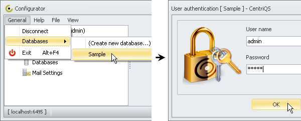 3. In the User authentication dialog box, type username and password of the database administrator account in the User name and Password boxes.