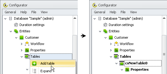 2. Click the right-pointing arrow next toEntities, click the right-pointing arrow next to required entity, right-click Tables, and click Add Table.