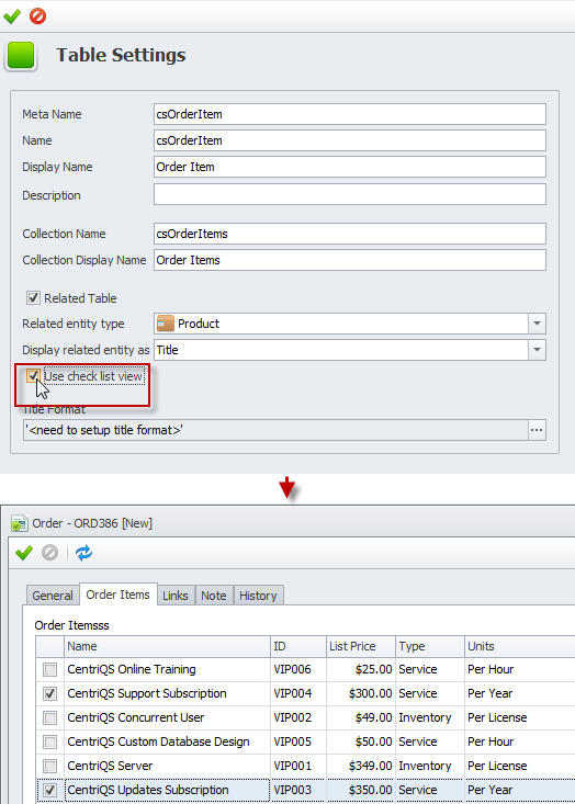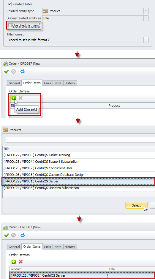 Note If you leave the Use check List view check box empty, users will click Add, click required item in the list, and then click Select to add items to the entity table.