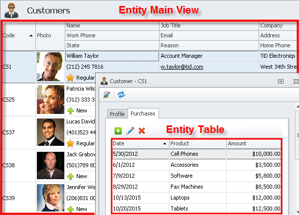 Entity table is displayed in the entity dialog box (detail view). For example, the Customer dialog box can show the Purchases tab with the table that lists all purchases of the given customer.