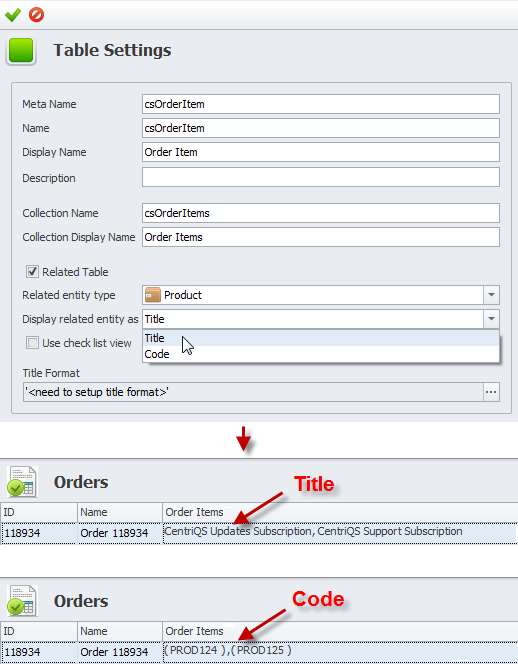 2. In the Display related entity as list, click Title or Code.