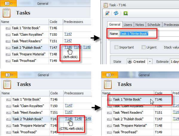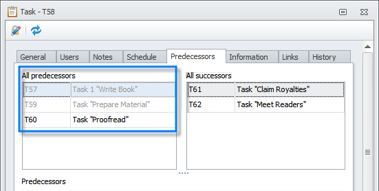 The code of predecessor tasks is displayed as link in the Predecessors column.