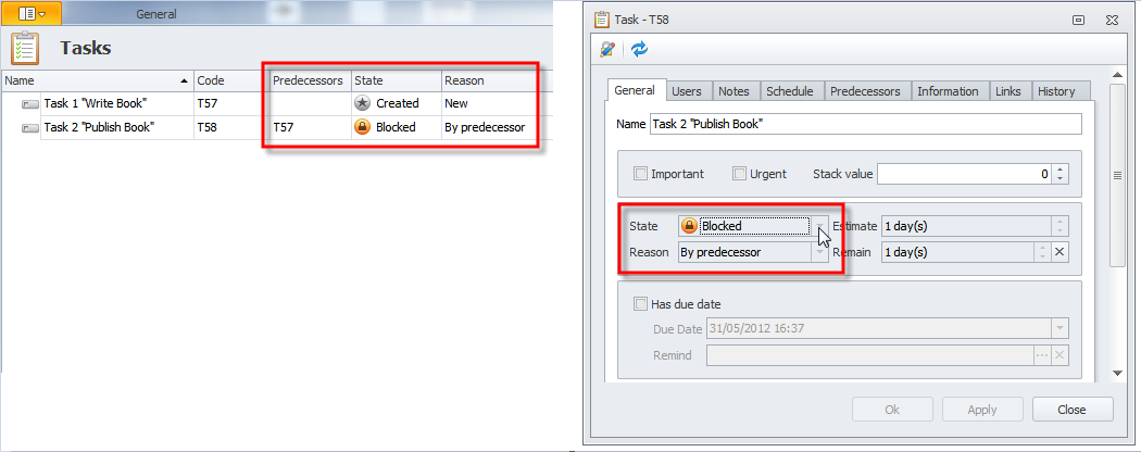 When predecessor task is added, the successor task gets the Blocked state, the By Predecessor reason, and the code of the predecessor task in thePredecessors column.