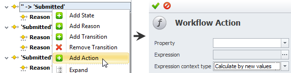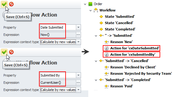 2. Click the required property in the Property box and set the expression in the Expression box. For example, when the Order entity changes to the Submitted state, the program can automatically fill in the Date Submitted property with current date and time value or the Submitted By property with current user value.