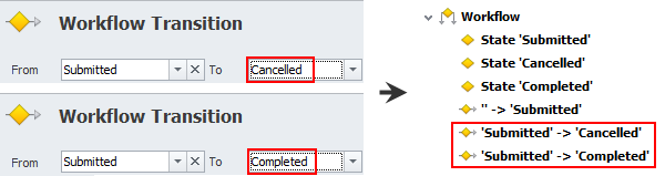 Note There may be multiple transitions from one state to other states, for example, the Order entity can be changed from the Submitted state to either the Cancelled or the Completed state.