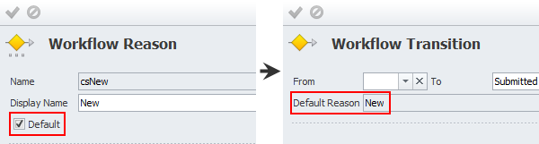 NoteEach transition should have at least one reason, but if you have a simple workflow and you don't want to specify the reason each time you change one entity state to another, you can leave the Default check box selected, so that the reason can be entered automatically when the entity state is changed.